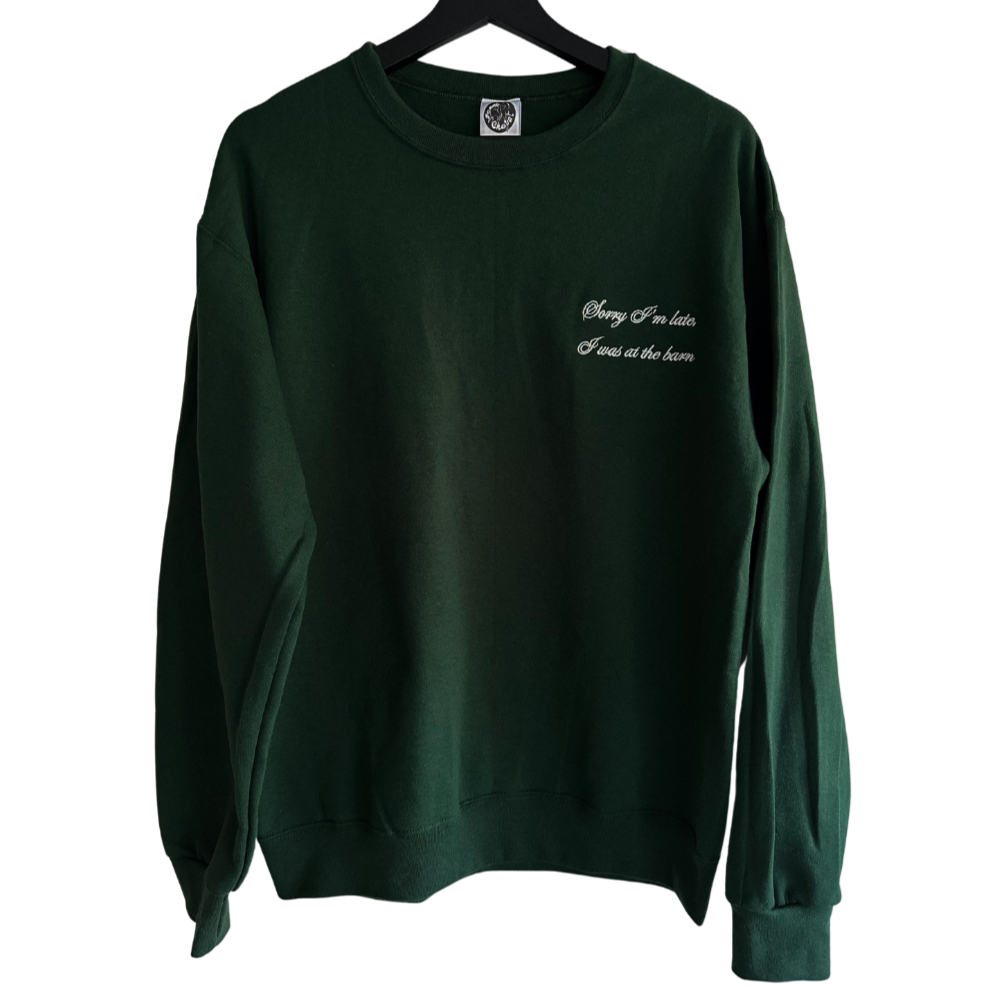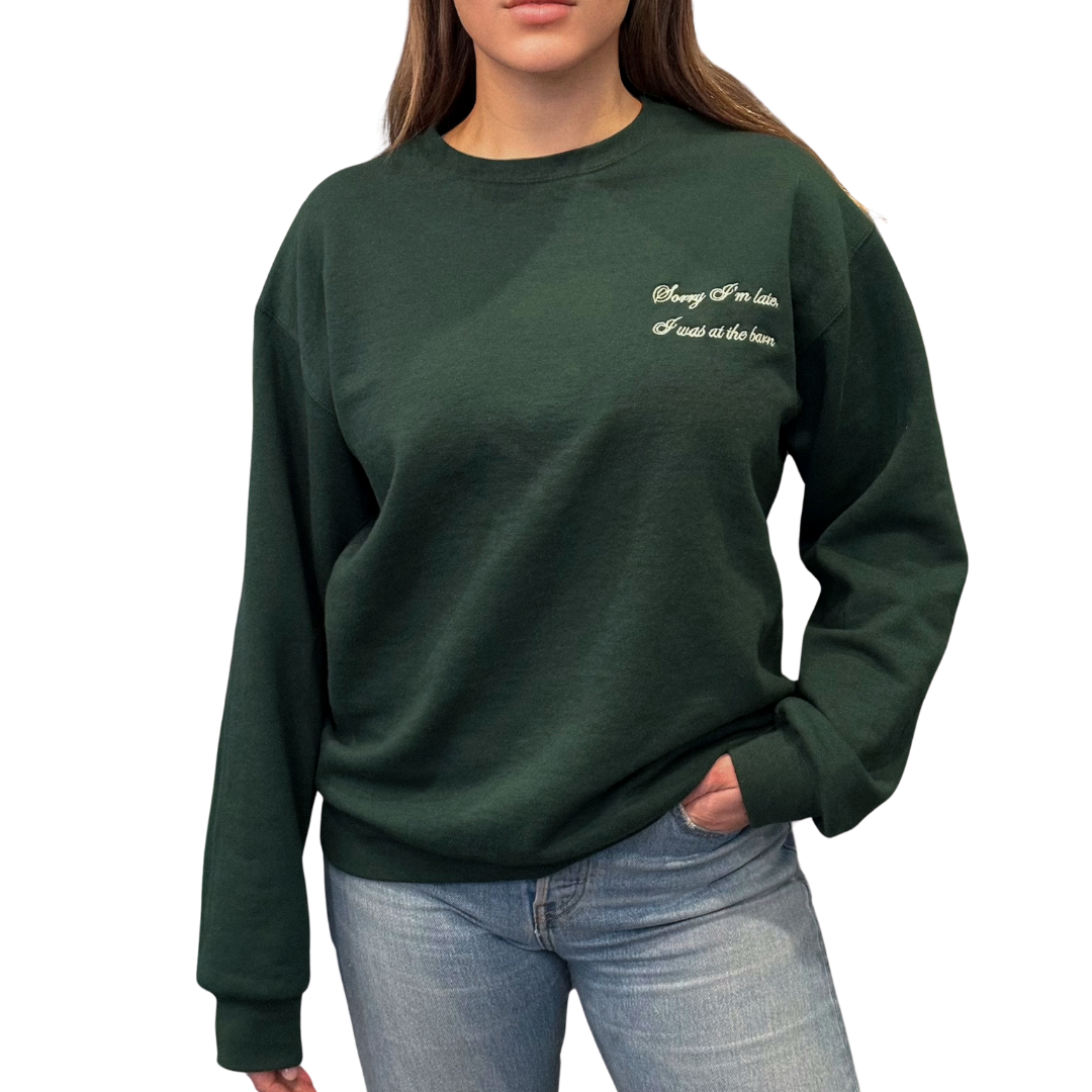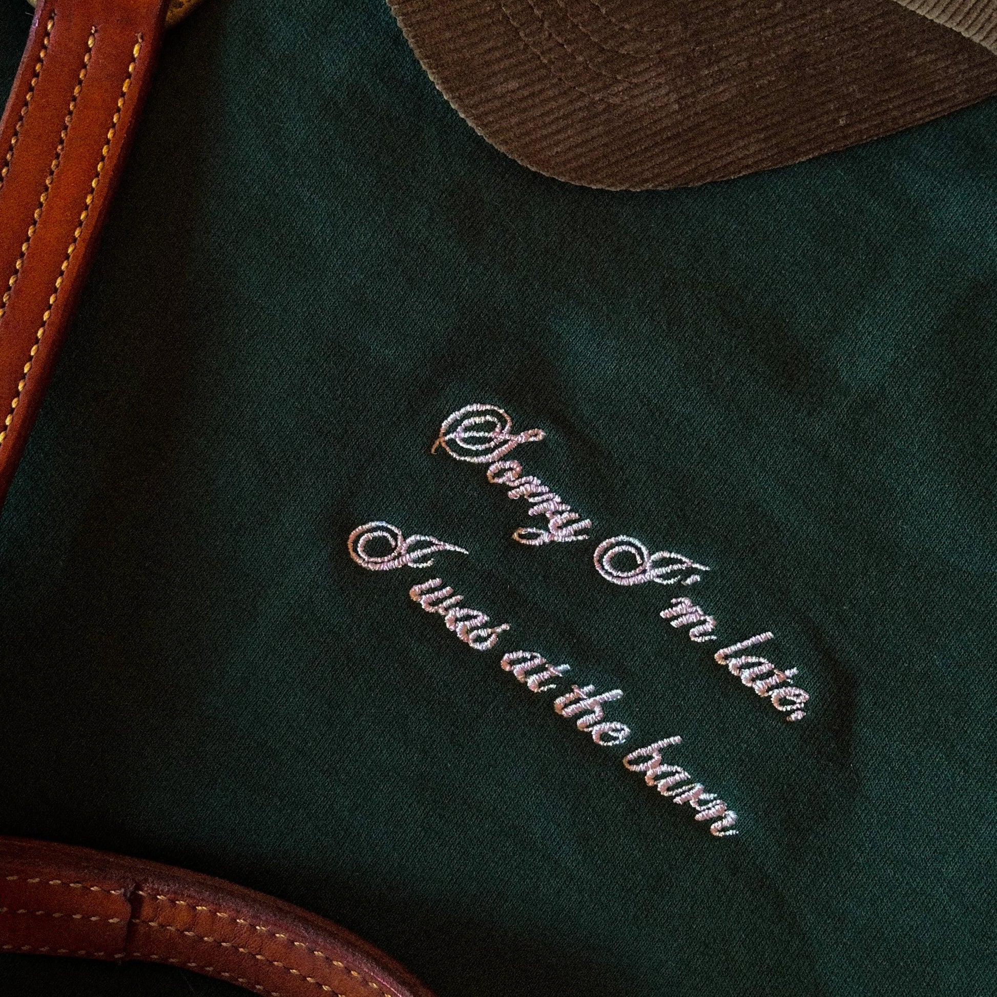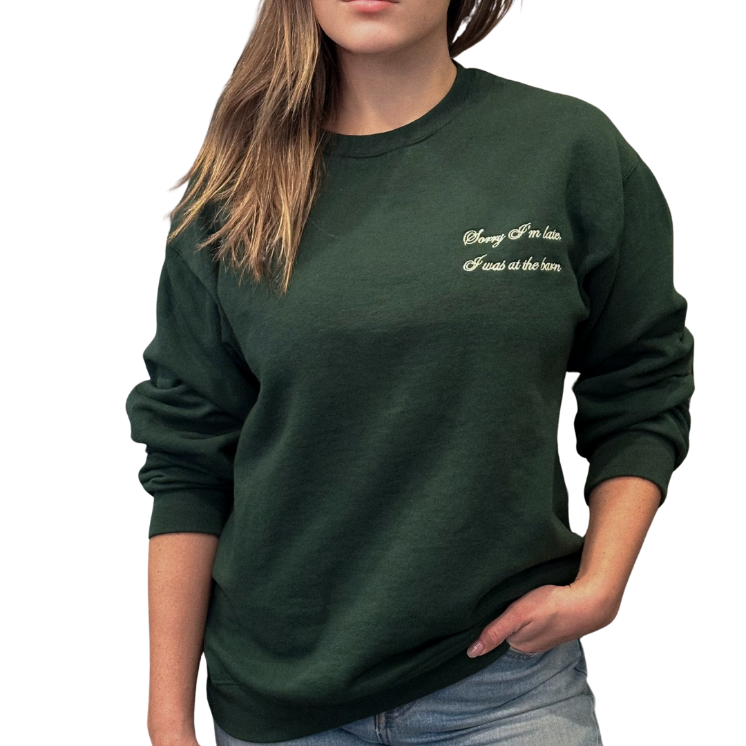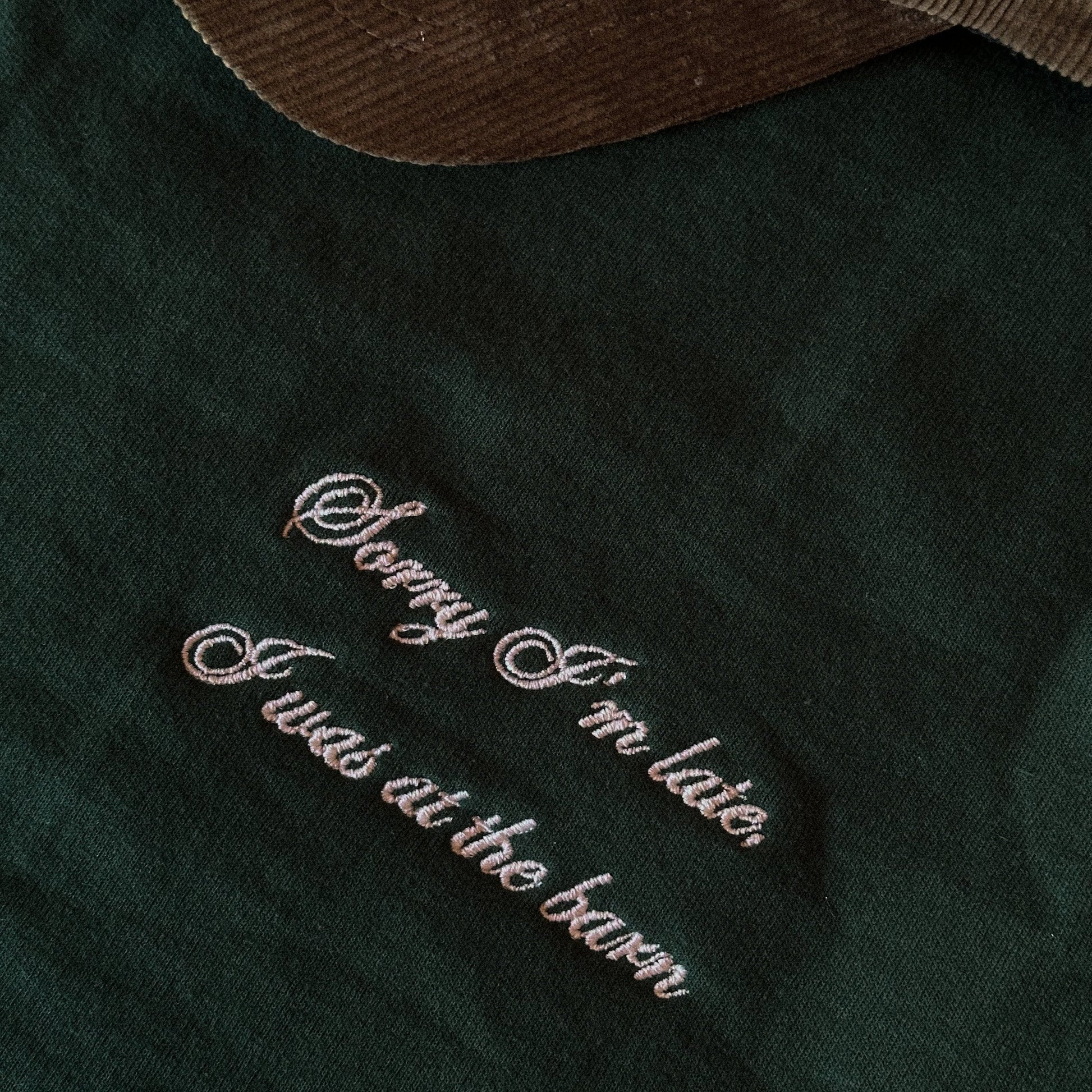 - Front Embroidery: 'Sorry I'm Late, I was at the barn' in white